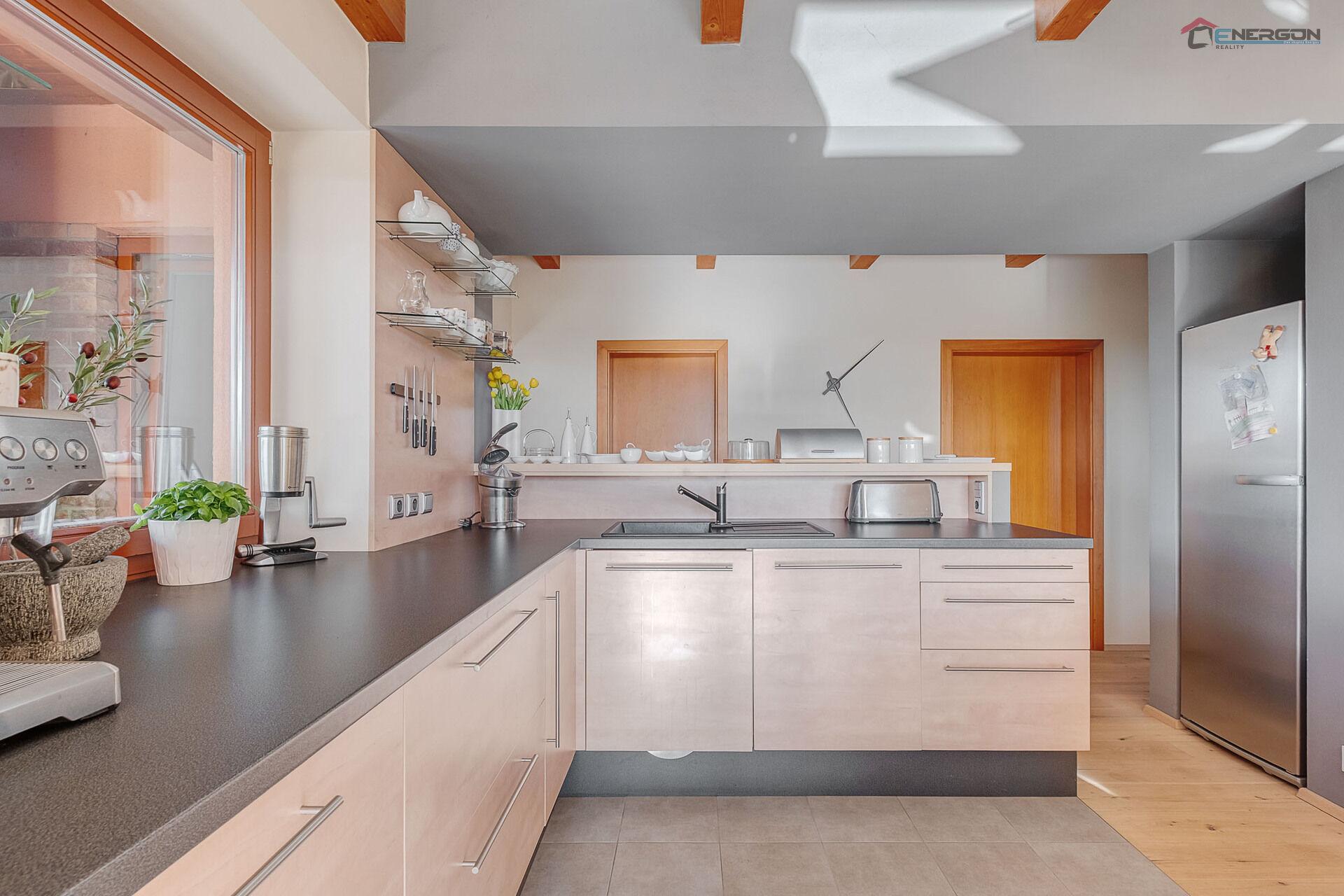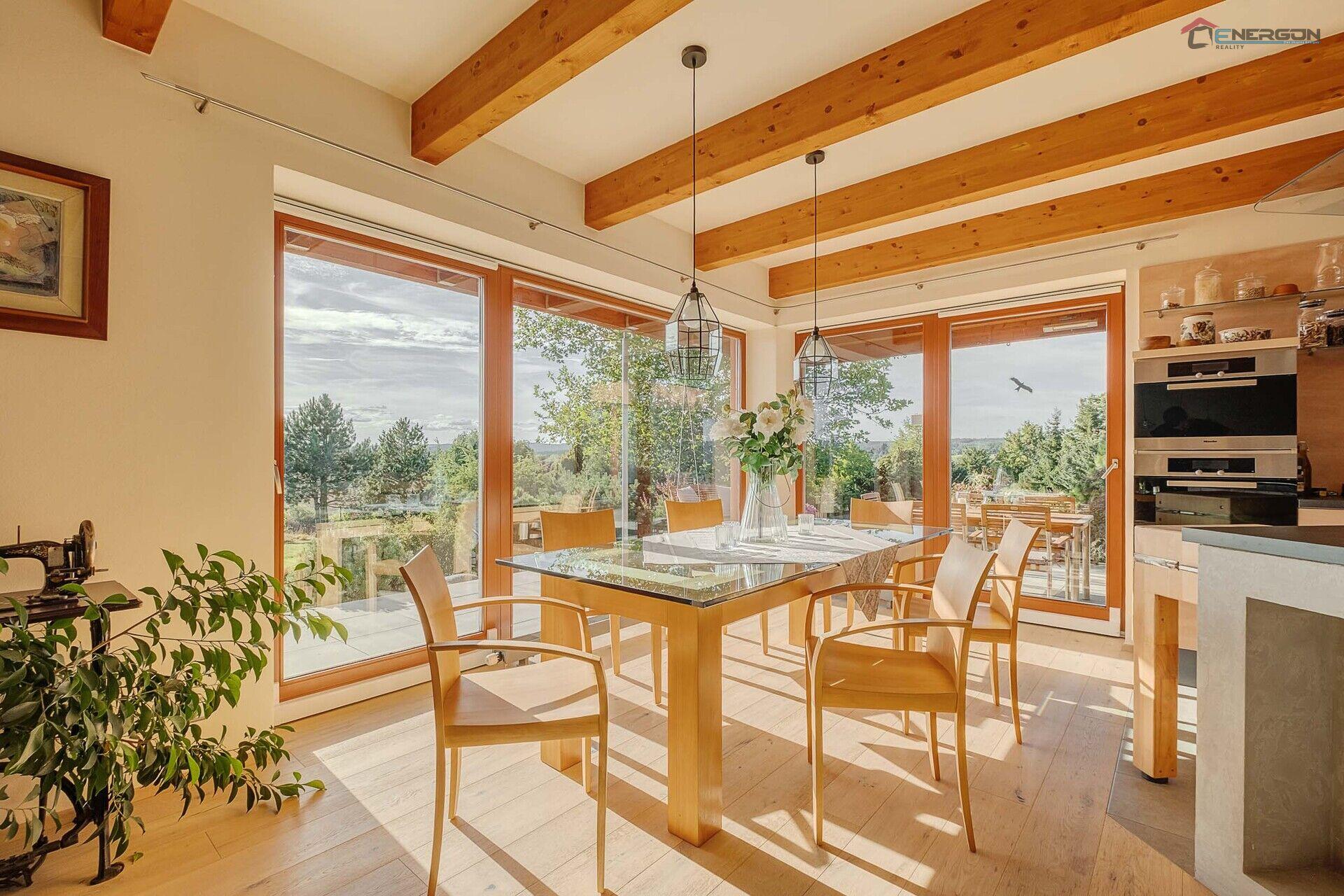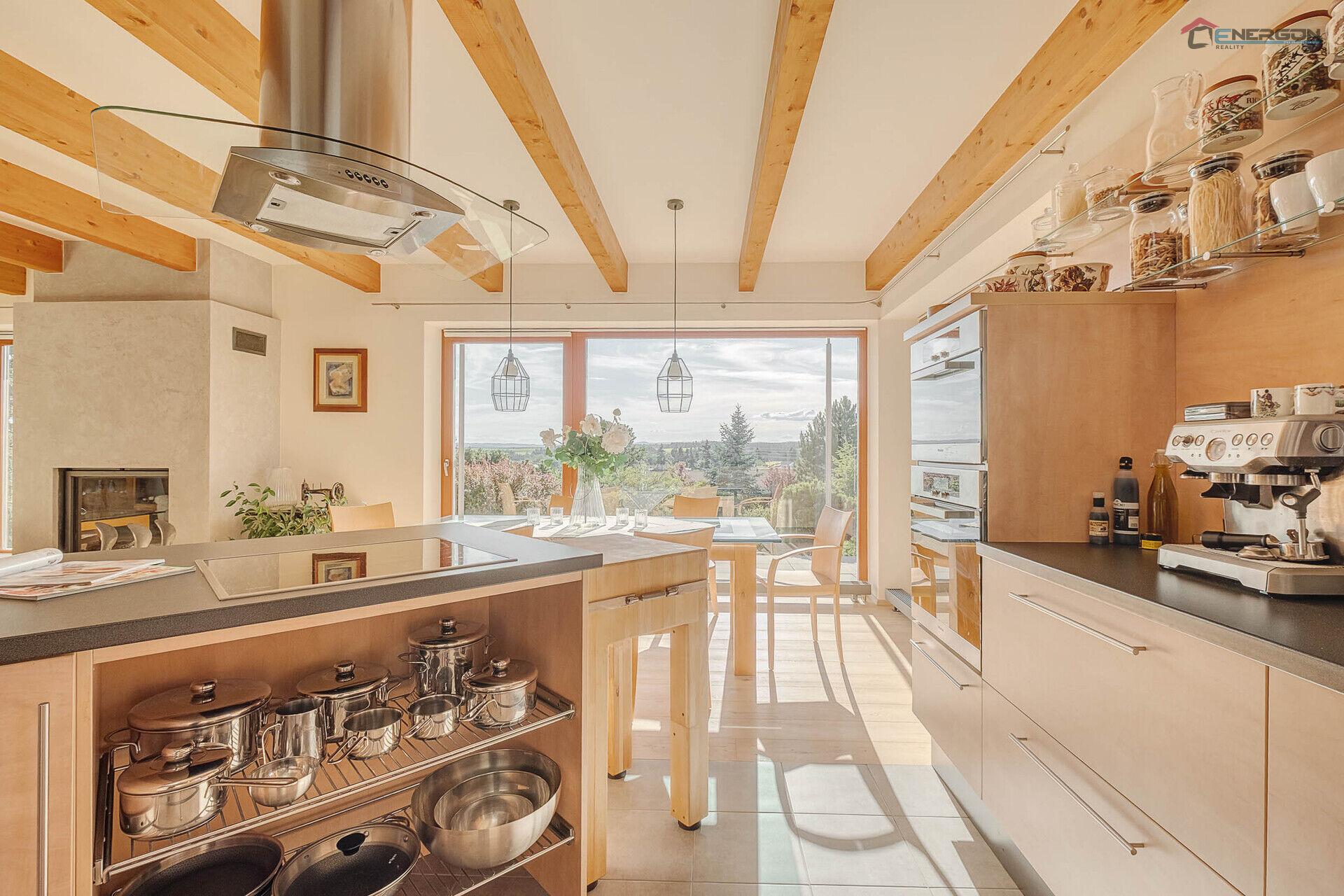 Nabízíme k prodeji velkoryse řešený rodinný dům s jedinečnou atmosférou a úžasným výhledem do krajiny. Jedná se o přízemní bungalov s dispozicí 5+KK a užitnou plochou 267m2. Součástí domu je dvojgaráž a veliká terasa. Dále tu je zahrada plná vzrostlých stromů a keřů, veliké koupací jezírko, nová moderní venkovní sauna. To vše na pozemku celkem 6.957m2. Srdcem domu je veliký obývací pokoj spojený s jídelním a kuchyňským koutem. Dostatek světla zajišťují velkoformátová okna směřující na jihozápad, poskytují uklidňující pohled do překrásné zahrady i ničím nerušený výhled v úhlu 180 ° na brdské lesy. Pocit prostoru a vzdušnosti dodávají také některé prosklené dveře. Součástí obývacího pokoje je velké akvárium. I když jste uvnitř domu, cítíte se spojeni se zahradou a okolní, krásnou přírodou. Dům je velmi prakticky řešený. Byl navržen tak, aby obsahoval křídlo rodičů – ložnice, šatna, koupelna, pracovna. A křídlo dětí – dva dětské pokoje, koupelna, dostatek prostoru pro šatní skříně ve spojovací chodbě. Obě křídla se spojují v obývacím pokoji u velkého rodinného stolu. K obývacímu pokoji přiléhá WC pro hosty, velká komora a technická místnost. Plus malá místnost jako technické zázemí akvária. Všechny části domu jsou promyšleně a prakticky rozdělené, přesto tvoří velmi příjemně propojený celek. Dispozice vnitřních prostor a stejně tak styl vybavení na Vás dýchne jedinečnou atmosférou. • rozloha pozemku je celkem 6.957 m2 • vzrostlé okrasné stromy a keře • tří jezírka propojená potokem, největší z nich je koupací s velkým dřevěným molem • venkovní gril, venkovní ohniště a venkovní sprcha • moderní venkovní sauna citlivě zasazená v zeleni • na pozemku je dostatek prostoru užít si klid, soukromí a relax • prostor pro budování dalších prvků, jako například zahradní altánek, dětské hřiště, kurt apod. • součást domu je dvojgaráž plus možnost parkování pro další vozy na pozemku, tři brány umožňující vjezd na pozemek • potenciál pozemku – v budoucnu případná možnost rozdělit pozemek a získat tak prostor k vybudování dalšího rodinného domu Technologie domu zahrnuje mimo jiné: • tepelné čerpadlo IVT • fotovoltaika 7.360Wp + baterie 20,5 kWh (součástí prodeje je i projekt a všechny komponenty na rozšíření systému o dalších 14 panelů) • krb s rozvodem teplého vzduchu do vedlejších místnosti • podlahové topení v kuchyni a koupelně • dům je napojen na obecní vodovod a kanalizaci, nicméně má na pozemku vlastní studnu (na zalévání, doplňování vody do systému jezírek) a obrovskou nádrž na dešťovou vodu • zahradní závlaha • zabezpečovací systém domu je napojený na bezpečnostní agenturu • robotická sekačka Malá Hraštice je příjemná, čistá a laskavá obec s přibližně tisícovkou obyvatel. Je zde mateřská škola a první stupeň základní školy. Menší, ale moderní obchod s potravinami, restaurace, vyhlášená cukrárna. Za 15 minut se dostanete na Dobříš, za 5 min na dálnici D4 a následně jste do 20 minut v Praze. Malá Hraštice je skvělá základna pro milovníky turistiky a cyklistiky. Brdské lesy lákají k návštěvě v každém ročním období. Tento rodinný dům je opravdovým skvostem a může se stát Vaším novým domovem. Neváhejte nás kontaktovat pro bližší informace a prohlídku.